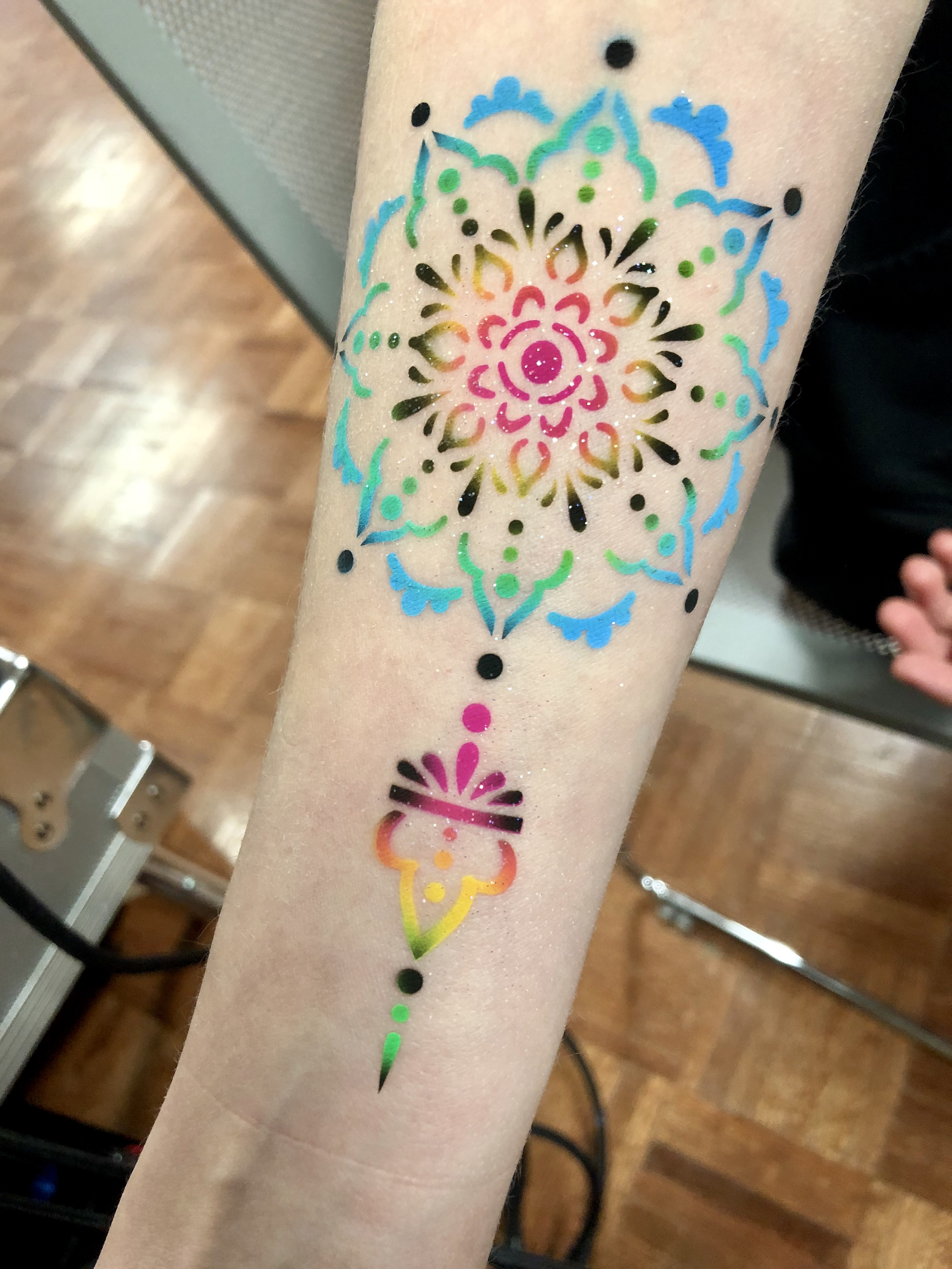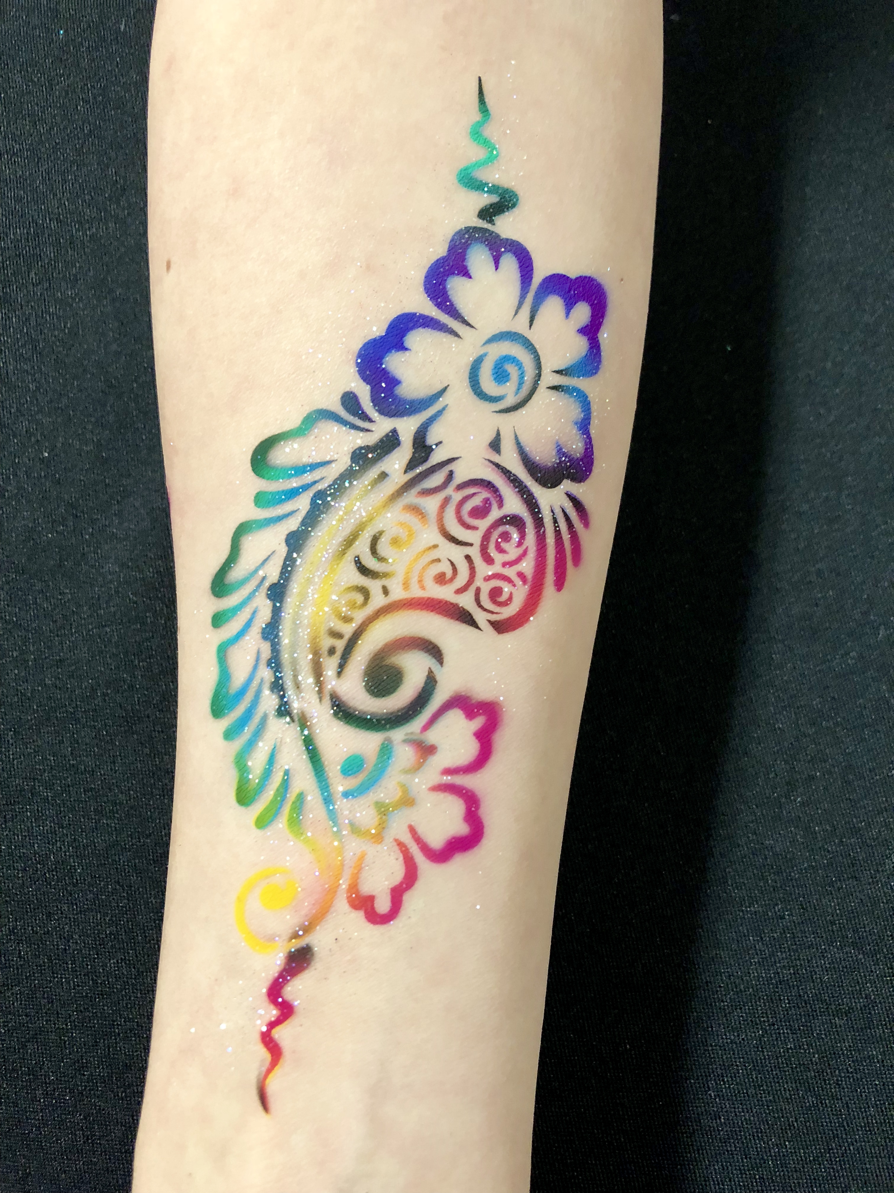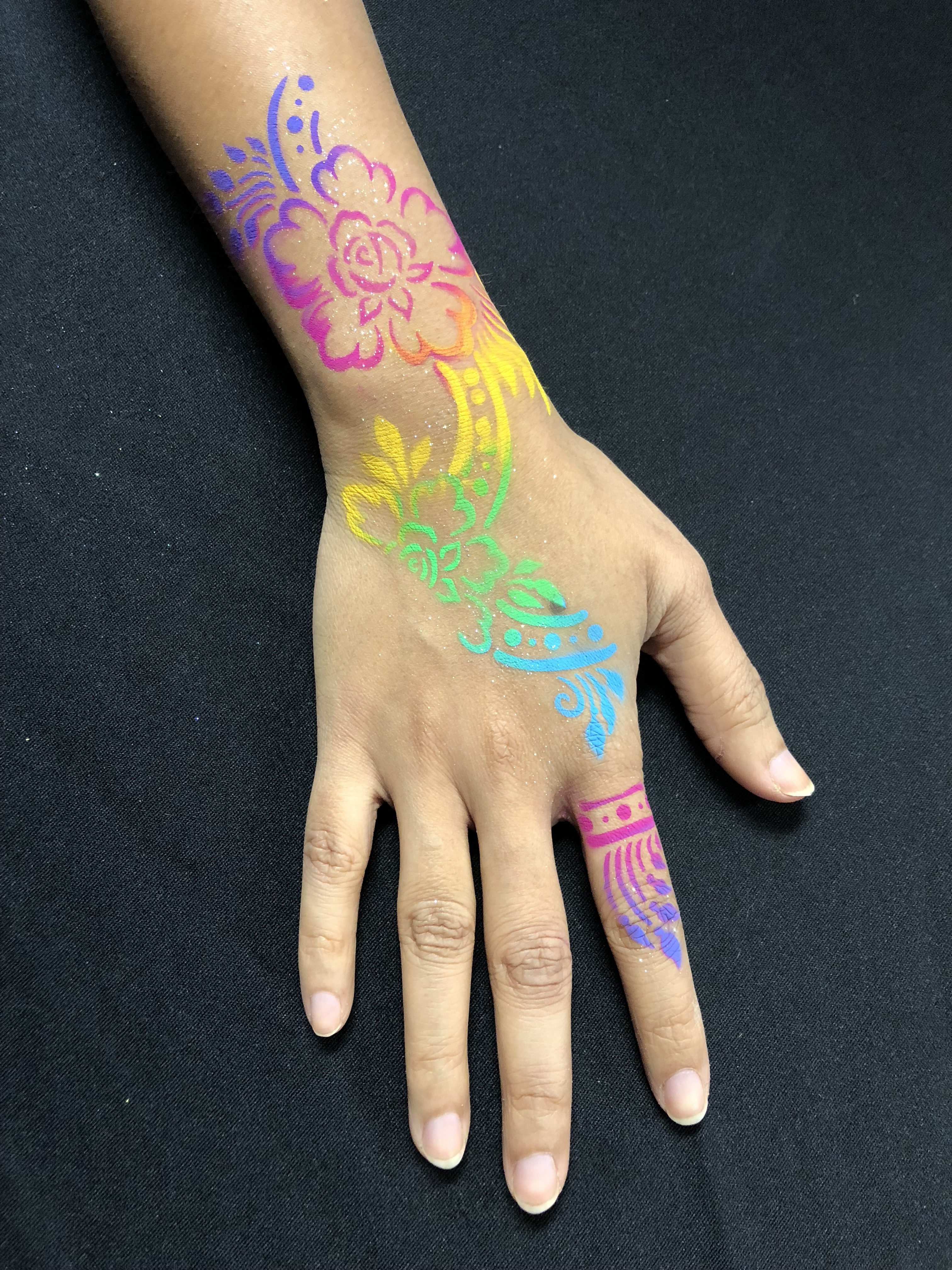 Airbrush Henna Tattoos dry instantly – no more long waits for your guest’s Henna to dry. Perfect for Dance Parties.. and we can even make them GLOW with our UV Airbrush Tattoo makeup. Choose from an assortment of Rainbow colors including UV Blacklight, Henna Brown, Where, Black, Gold, Silver and Rose Gold Metallics. Add a little glitter or rhinestones for extra sparkle!