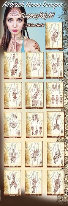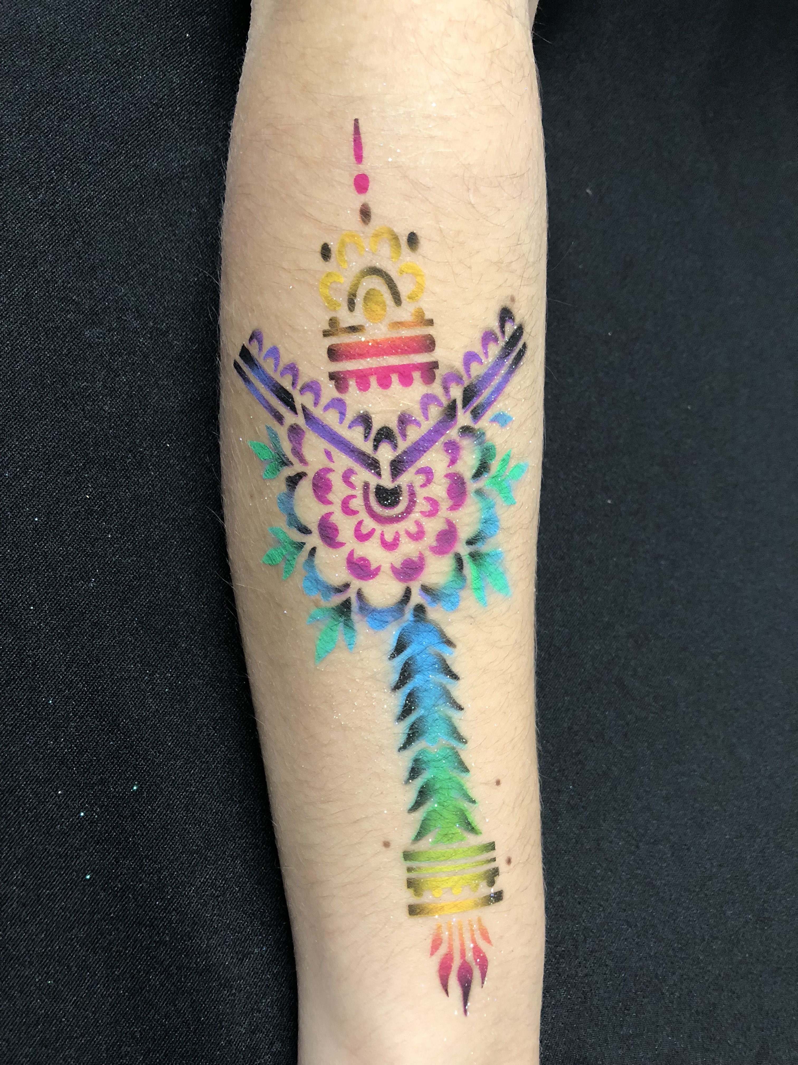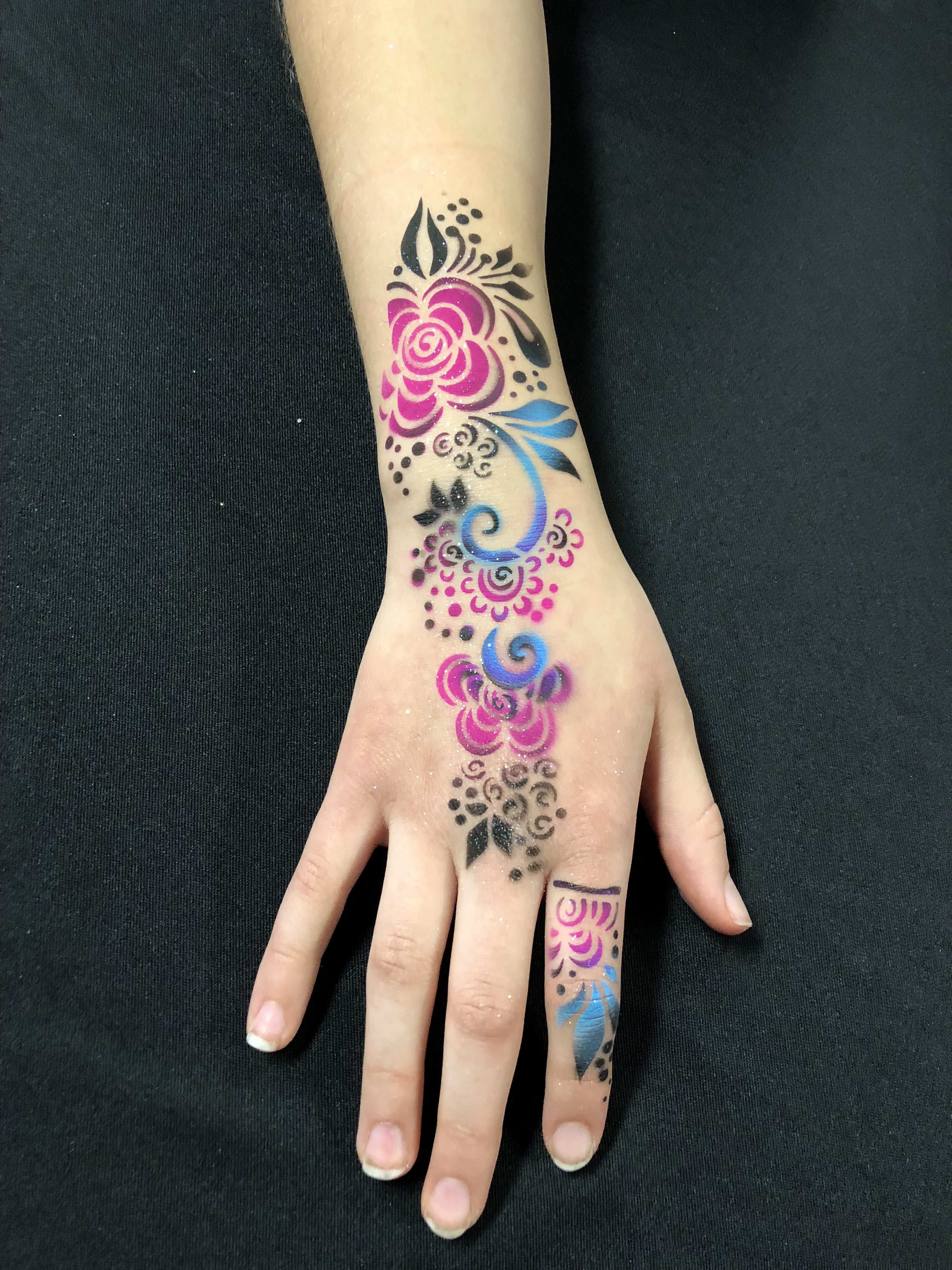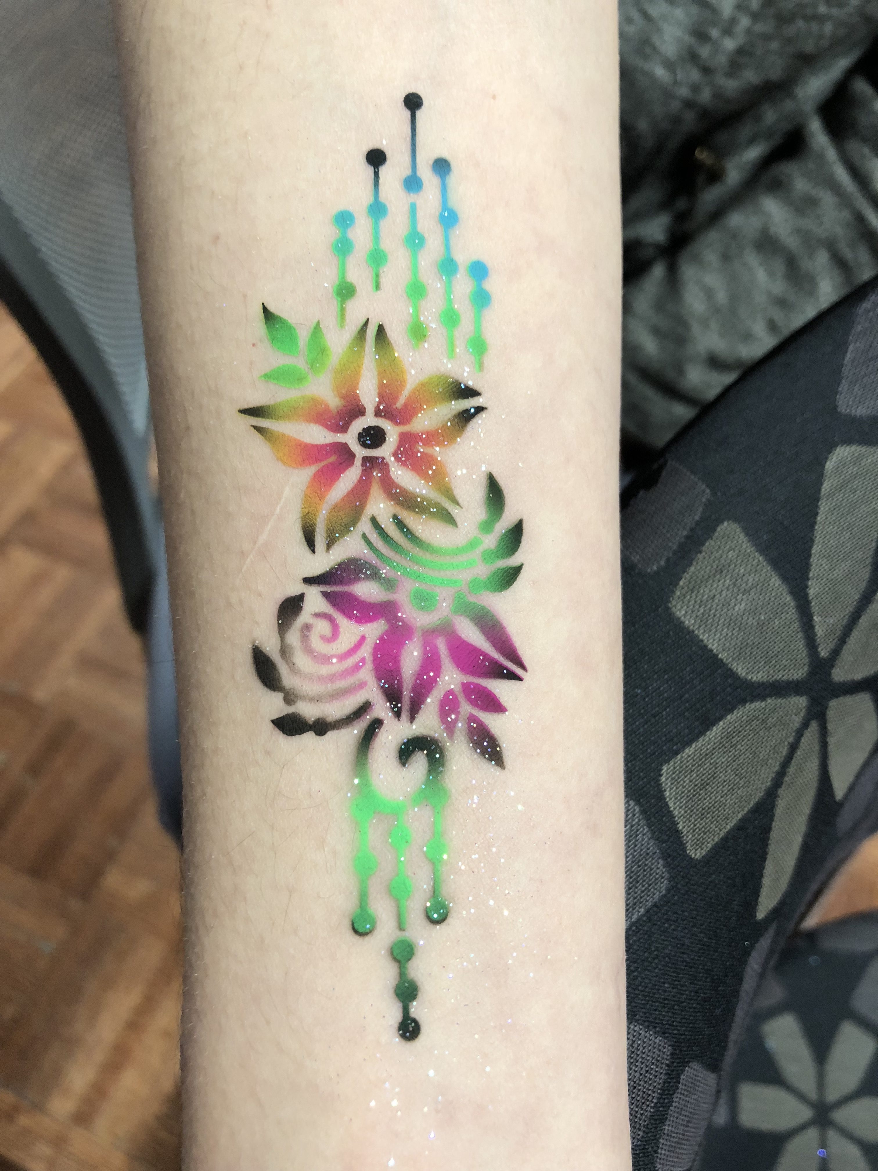 Airbrush Henna Tattoos dry instantly – no more long waits for your guest’s Henna to dry. Perfect for Dance Parties.. and we can even make them GLOW with our UV Airbrush Tattoo makeup. Choose from an assortment of Rainbow colors including UV Blacklight, Henna Brown, Where, Black, Gold, Silver and Rose Gold Metallics. Add a little glitter or rhinestones for extra sparkle!