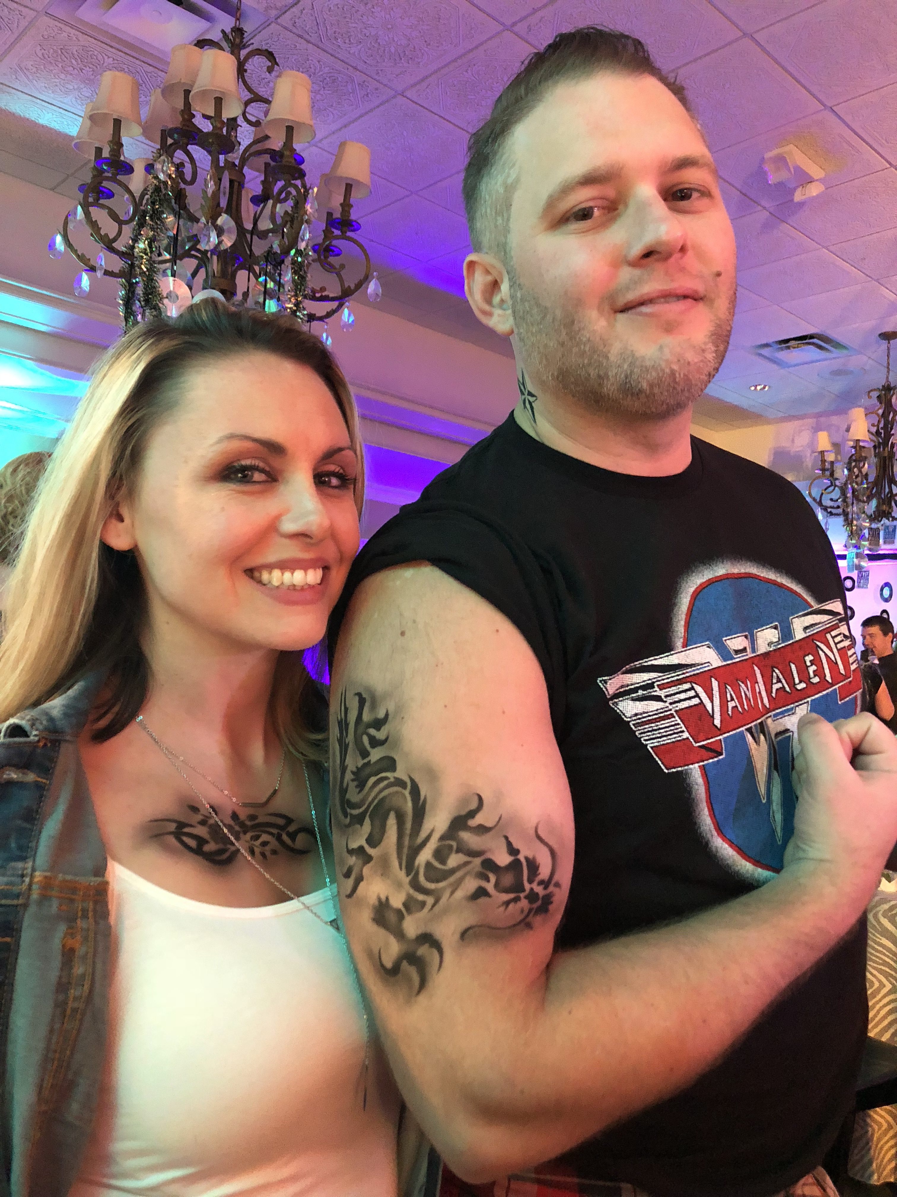 Airbrush Tattoos create a big buzz in the crowd! Seconds to apply and seconds to dry, this temporary body art is perfect for large parties and events. Our ‘Tats’ are a fun and cost effective way to entertain your many guests. With 100’s of designs to choose from, our tattoos can last up to five days with proper care yet are easily removable with mineral oil or rubbing alcohol. Our Airbrush Makeup formulas is safe, non-toxic, hypoallergenic and specially formulated for the skin only. Want extra sparkle? We’ll glitter ’em! Custom stencils with your brand or logo are available.